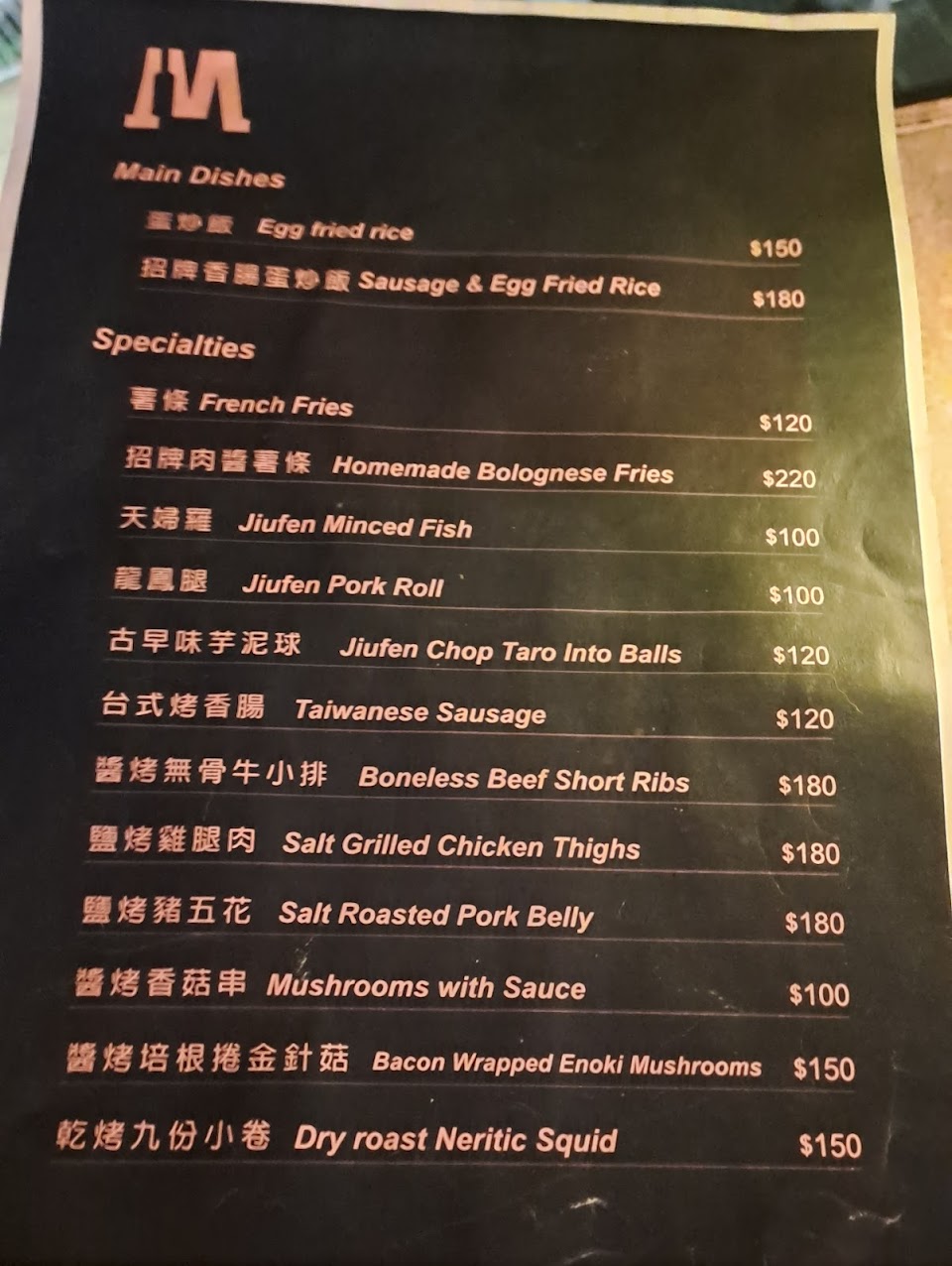 餐點有提供蛋炒飯、炸物跟烤物,還有一些台灣傳統特色小吃,少不了的啤酒、調酒等酒精飲料讓你在九份的夜可以放鬆享受微醺~