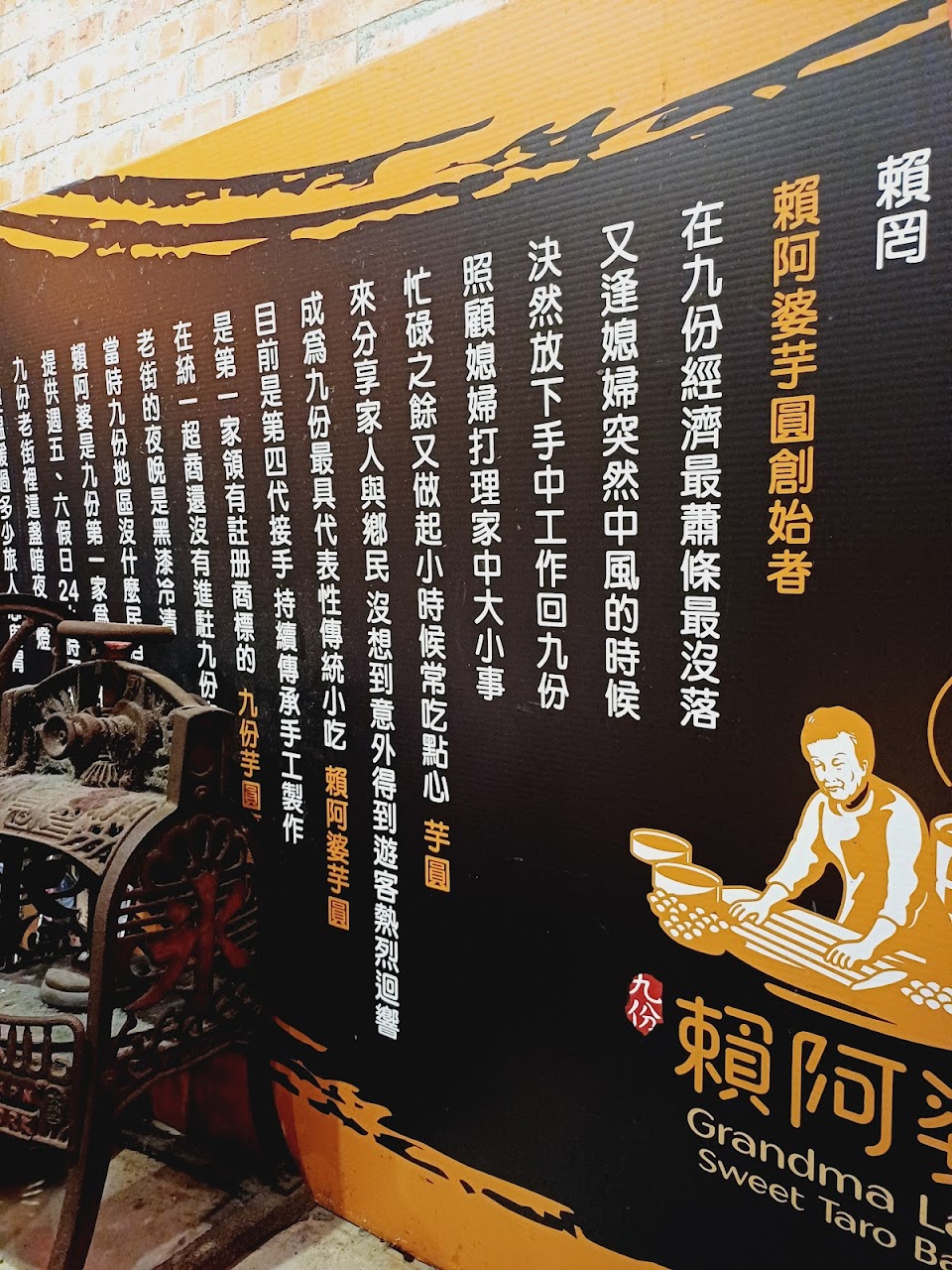 賴阿婆芋圓是九份相當有名的芋圓,至於排名第幾,直接跟另一家有名的阿柑姨的兩碗都吃看看,兩家都是賣五十元一碗。賴阿婆位於九份老街的中心,店內有復古的氛圍,下午時段經過人潮也是非常多,多到位子都不夠許多人也在旁站著吃。阿柑姨則是在高點有景觀,人潮雖多但是位子也比較多,(有時候也有人多到連景觀都快看不到的狀況)我們選擇下午茶阿柑姨、晚上吃賴阿婆,都很好吃,料有點不一樣,糖水也有點不一樣,來過九份多次,每次都會吃,賴阿婆的芋圓口味最多。