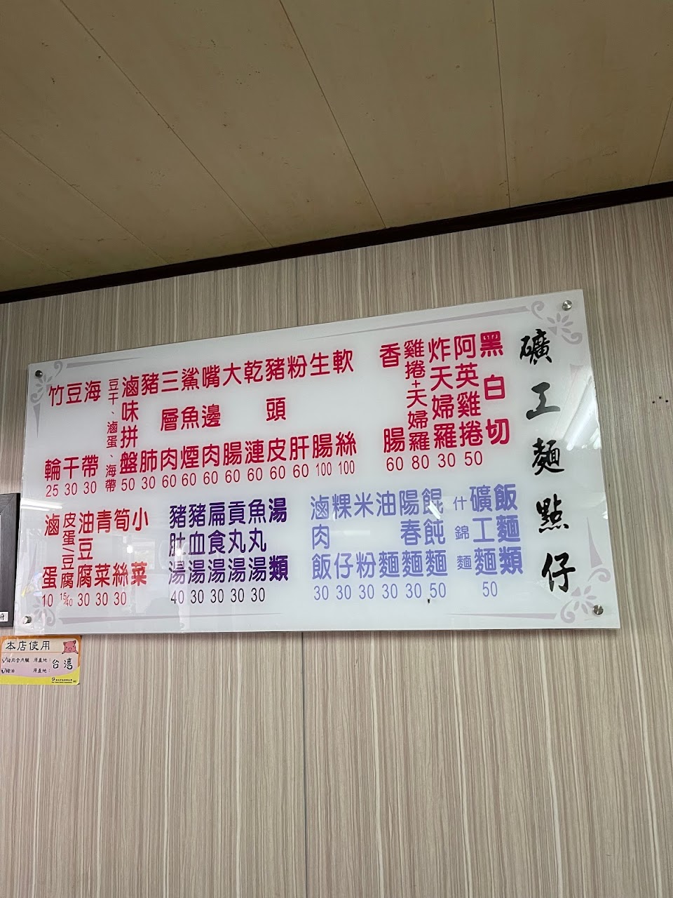 點了曠工麵、魚丸湯、乾粄條、雞捲、燙青菜、陽春麵、豬血湯