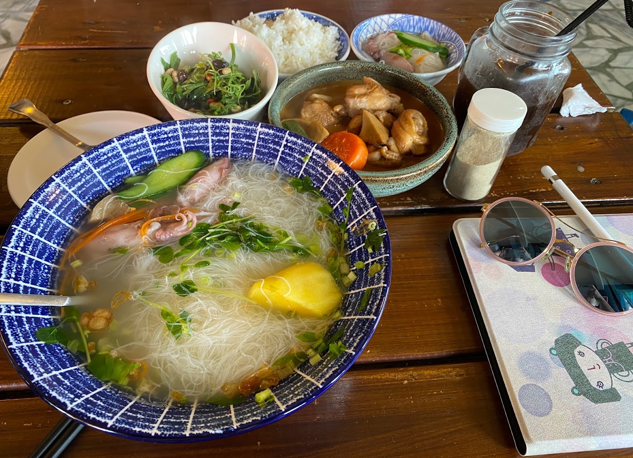 好吃的食物,無敵海景,溫馨有味道的佈置和滿園的綠植物。太好吃了,吃快光了才想要拍。小卷米粉海鮮新鮮湯頭好,烤雞趐、墨西哥餅、香煎里肌都很有異國風味。
