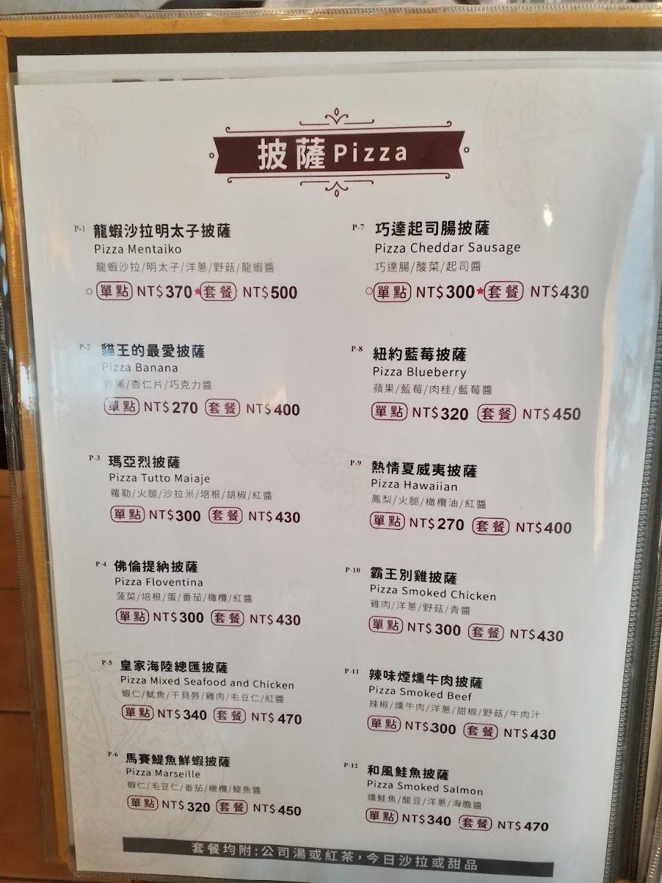 餐點蠻好吃的但是素食的部分好像供應的跟他菜單上的不太一樣,要問服務員,餐點滿1600會送花草茶,這個要主動問才有,松露披薩很棒皮脆脆的但有的部分吃起來有點焦,羅宋湯超級好喝,竟然還有肉,肉柔軟、量也很多讚。廁所的門有點卡卡的不好開