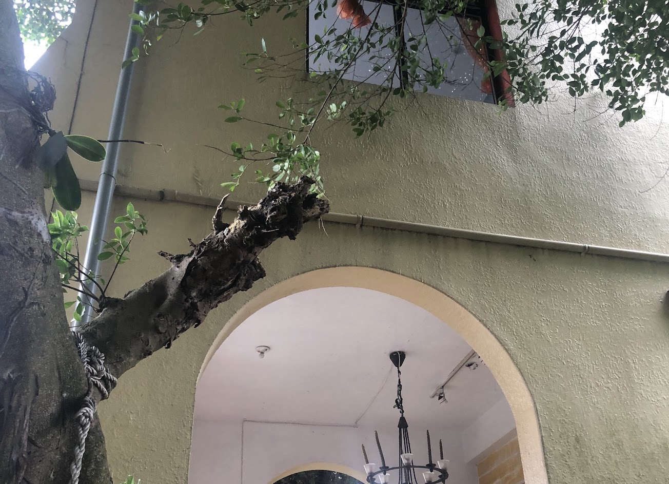 二樓角落裡越過荒煙蔓草的對面廢棄老屋看到遠處的青天藍海,陽台上、老樹下,輕風徐來,悠閒的用餐,食物意外的也很有水準;pizza、意麵不輸任何鬧市餐廳,更意外好喝的是南瓜濃湯,連喝兩碗。