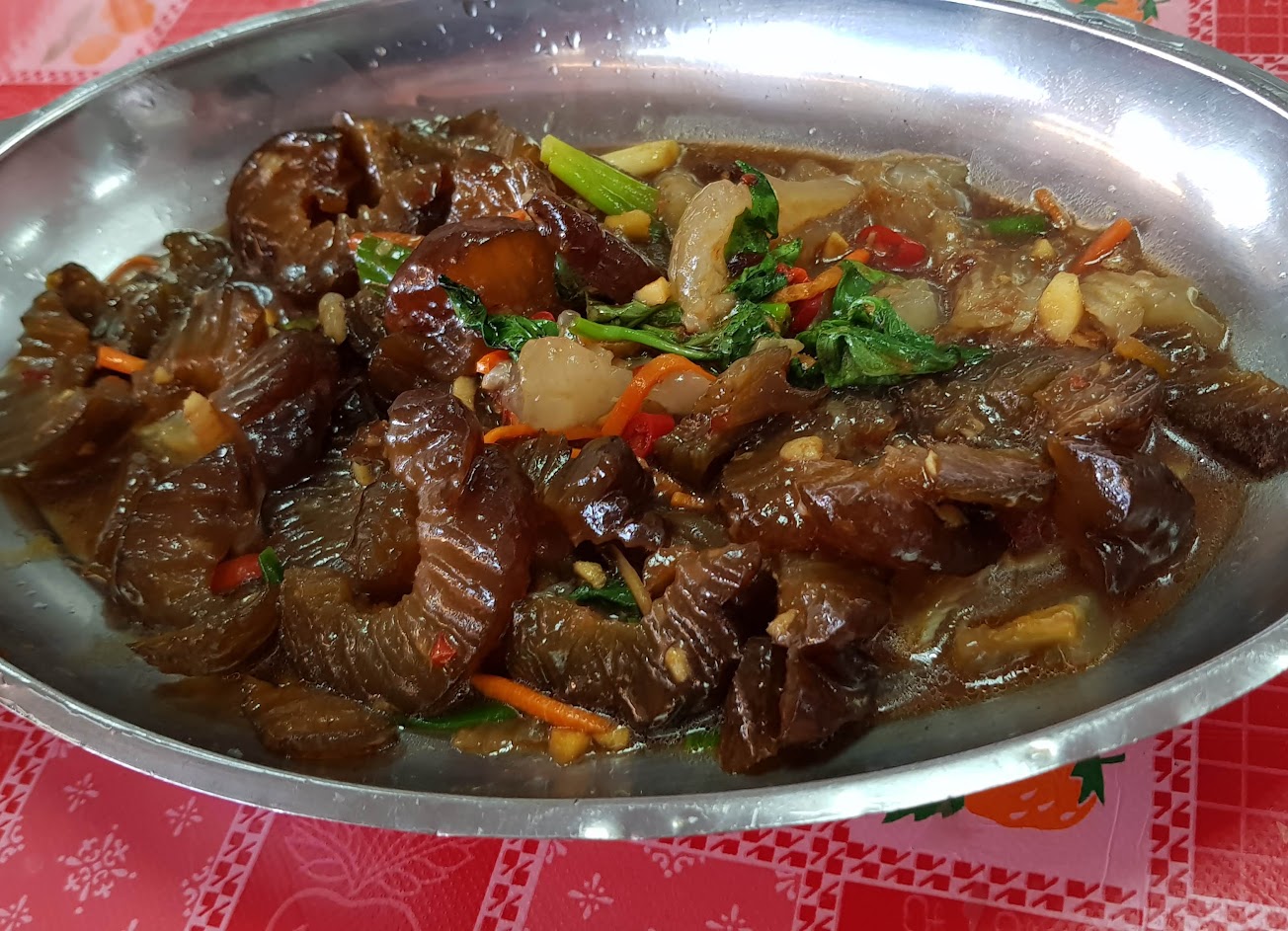 炒海瓜子肉多不辣,涼拌海帶微辣油有一點多,熱炒海參魚皮Q彈不辣,炒高麗菜是附贈的,酥炸瀨尿蝦(4尾但拍攝時被夾走少一塊)偏鹹但肉質甜不吃鹹的撥殼吃即可。
