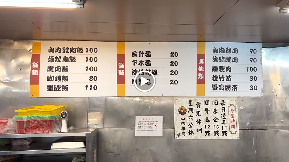 位於南機場夜市入口處相當好找,本次點了山內雞肉飯,內容物為一盤白斬雞肉、一碗白飯與清湯一碗。雞肉還算不少,肉質紮實,建議加辣風味更佳。