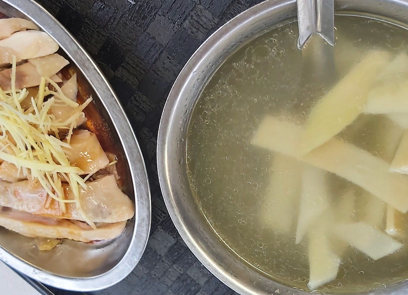 一整大塊的雞肉前面有些許骨頭,後面則是沒有但口感偏柴(但我很愛柴柴的),推薦吃法是一塊肉先沾醬、肉配飯,再把沒沾到的部分配桂竹筍湯喝下去!沒吃到菜很單調建議另外點燙青菜和湯。
