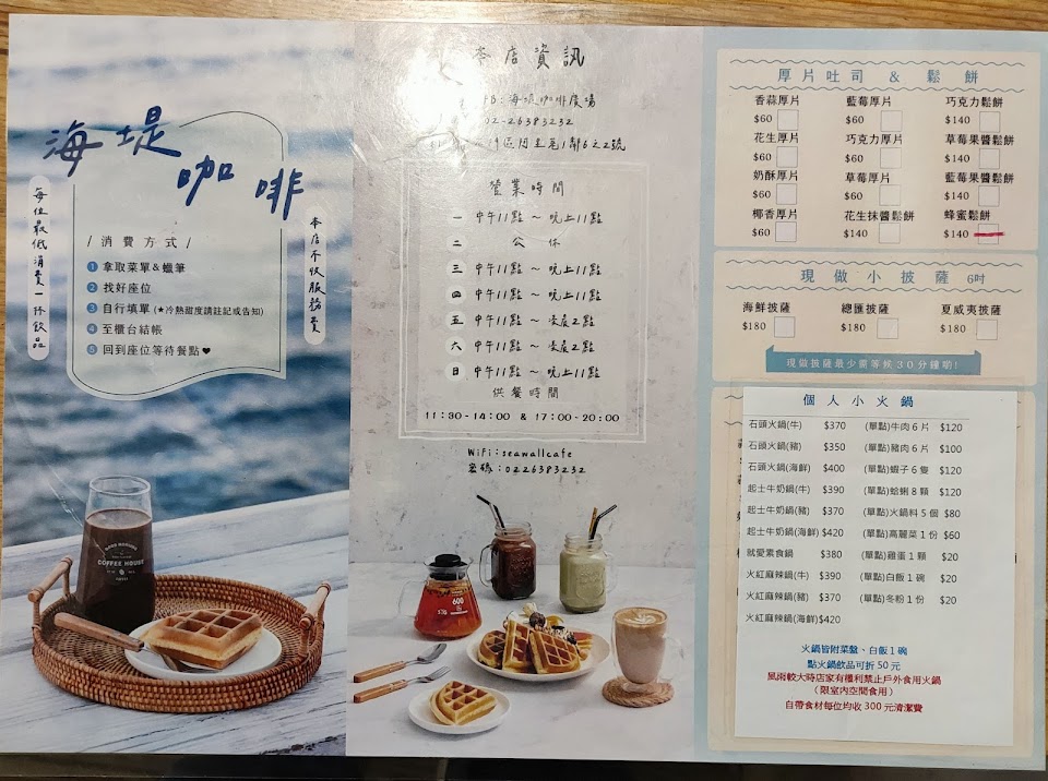 餐點的價格還好不會很貴東西也還不錯吃海景漂亮又靜無人打擾人比較少 值得再去的地方