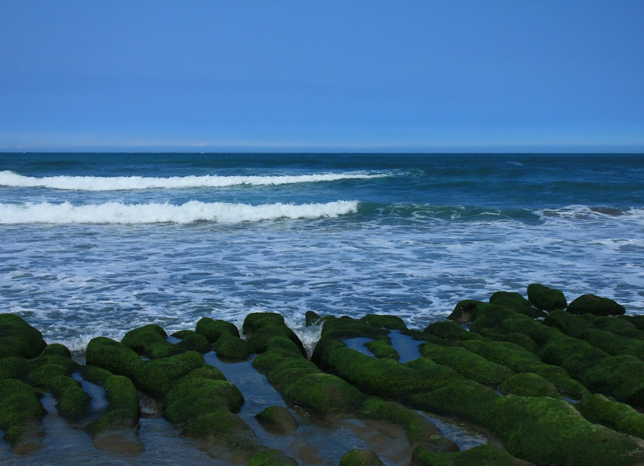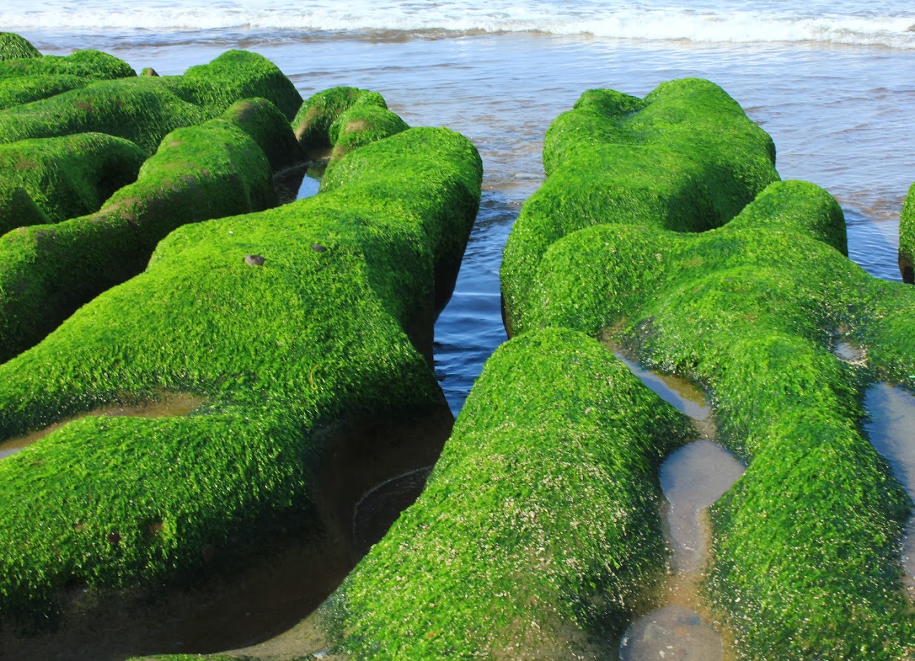 大片海藻附著在石槽上,形成一條又一條的綠石槽,把整個海岸染成鮮翠的色彩,放眼望去綠意盎然