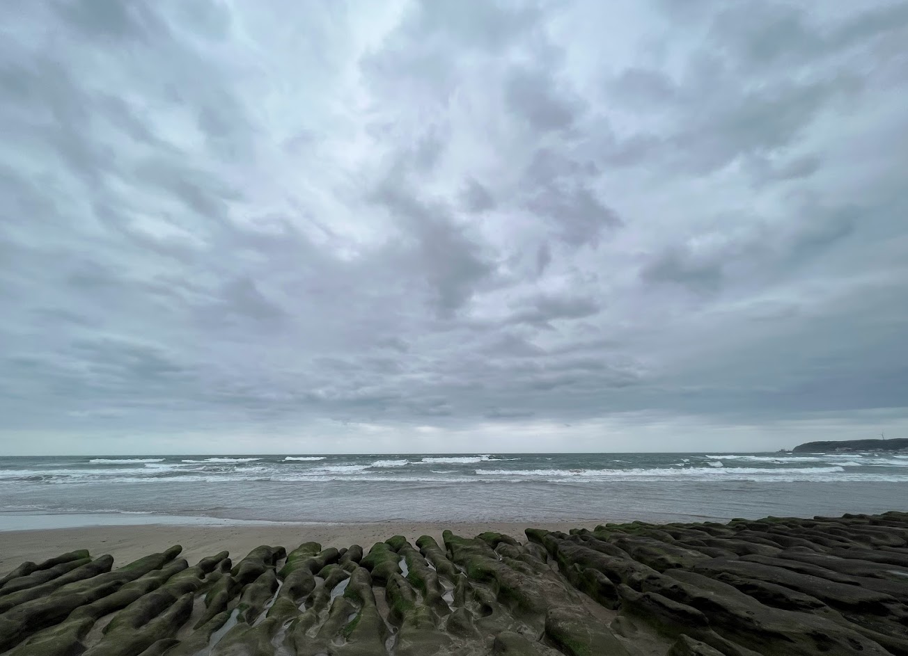 春季限定的綠地毯,要注意潮汐變化,此次於下午抵達,正逢漲潮時間,露出的綠石槽比較少,不過仍能踩著大片沙灘,欣賞浪花海景,適合全家出遊的好地方。