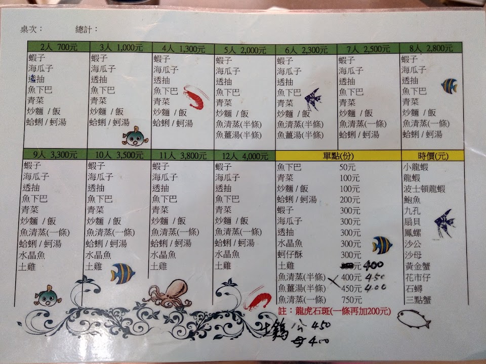 一開始看了Google前面的好評,帶著半信半疑的態度進來, 點了2人套餐,700元(含:炒麵,清蒸蝦,烤魚下巴,炸透抽,炒青菜,牡蠣豆腐湯),因為太好吃,又加點一份小的炸透抽+150(真的很新鮮!)