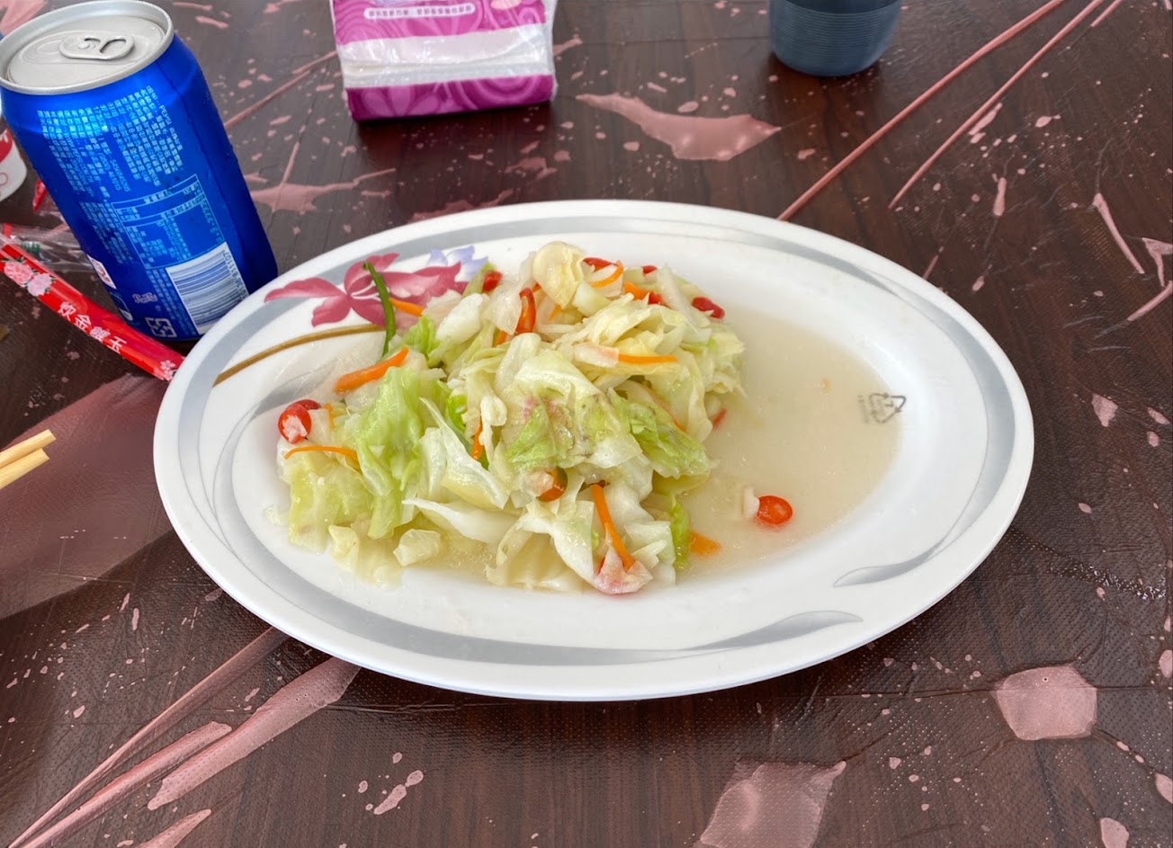 餐廳點菜阿姨一直跟廚師聊天,同一句話要講很多次她才聽得到,在餐廳點的高麗菜份量如圖。