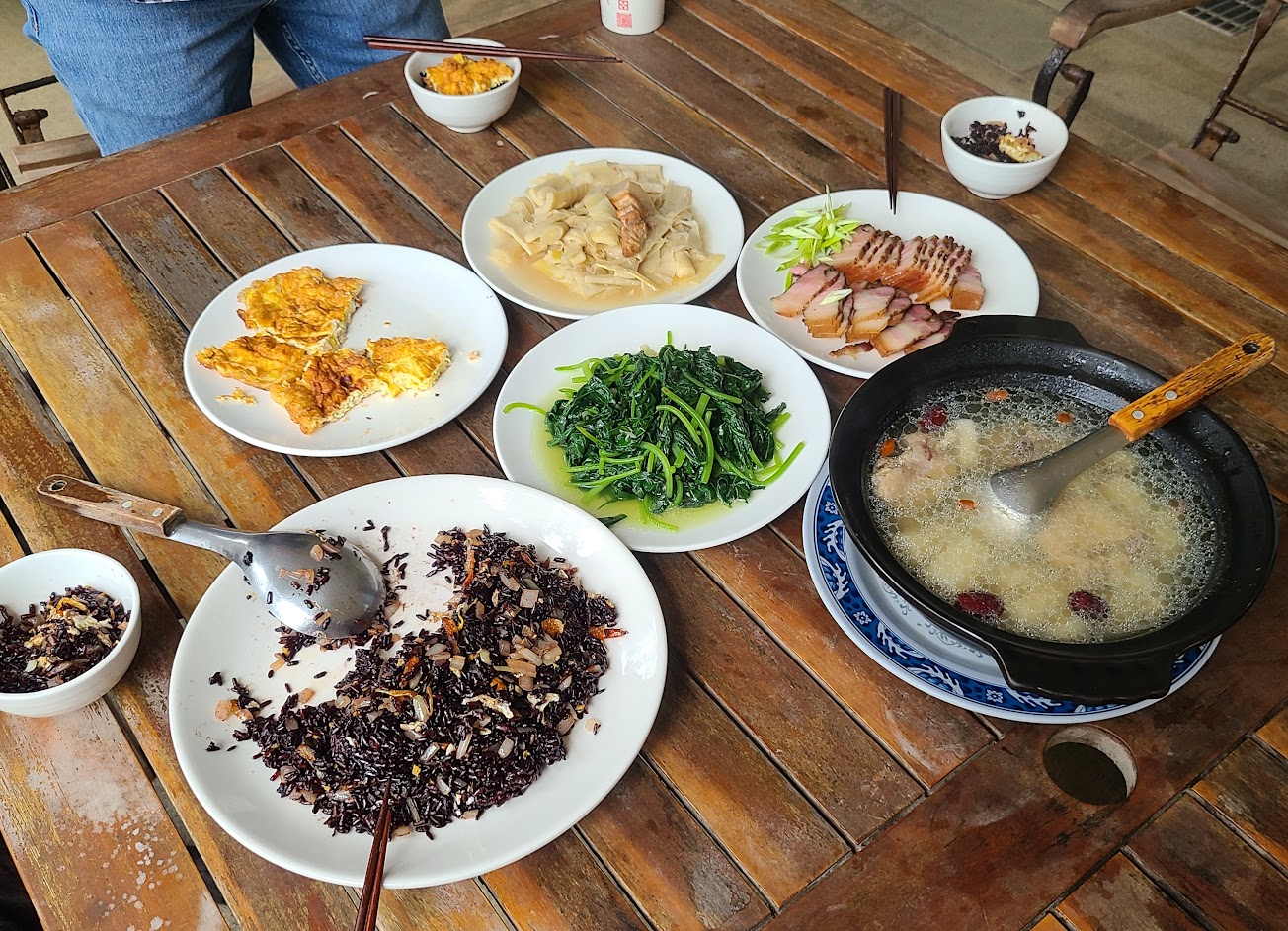 黑米炒飯、炒青菜、鹹豬肉、炒竹筍、竹筍雞湯,