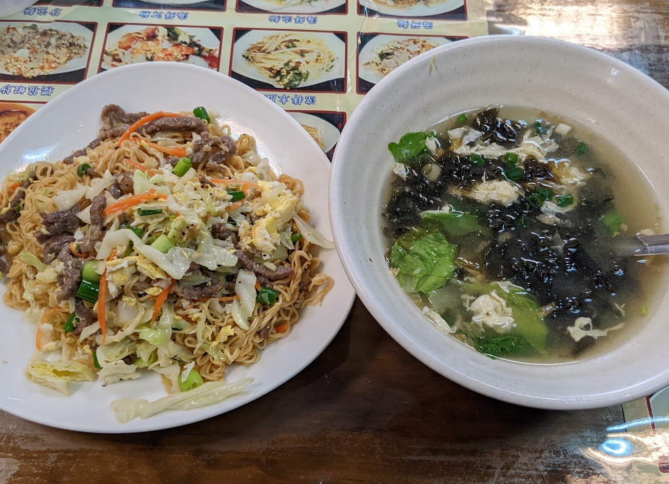 炒泡麵的牛肉麵跟橡皮筋一樣,麵也沒有很入味….蛋花湯真的是便宜又大碗!