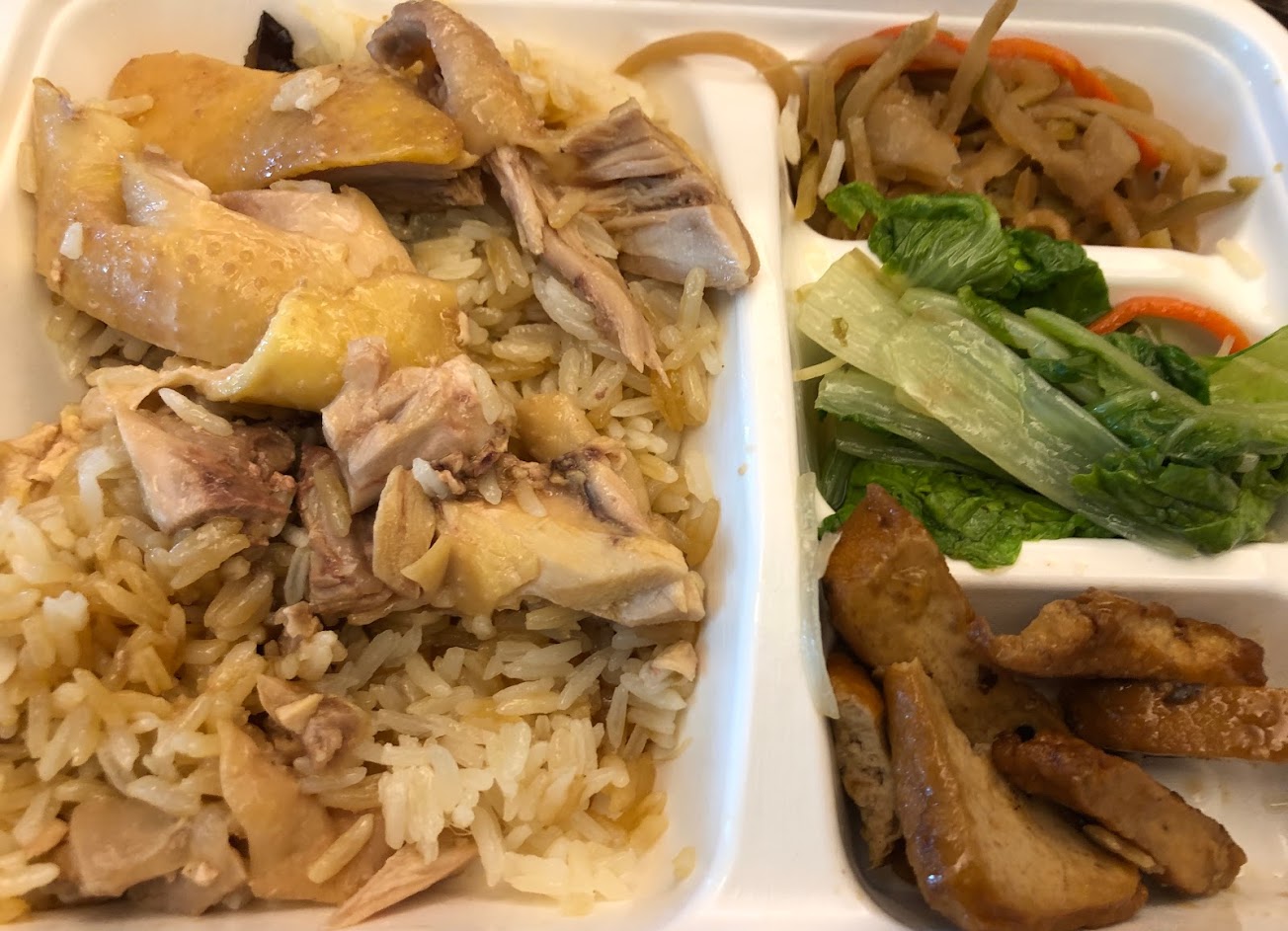 外帶份量很夠,還有一碗青菜佐滷肉醬, 飯很有味道,醃漬的配菜清爽,比美食街海南雞飯好吃但偏貴。