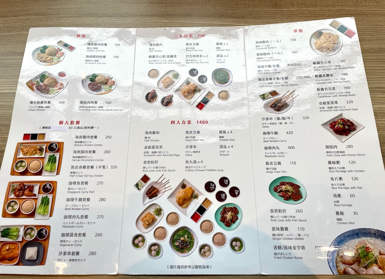 個人套餐不錯,有菜有肉有湯有飯有甜點,餐點表現中上,表現最好的是海南雞的三種醬料,非常出色,最可惜的地方是雞肉旁邊的蔥絲混雜香菜梗,也沒有不要香菜的選項或警語,對不吃香菜的人很不友好,誤食之後直接反胃。此外點餐時以為湯品是固定,直到隔壁桌點餐發現店員有主動詢問湯品選擇,感覺店員點餐的受訓品質有差異。