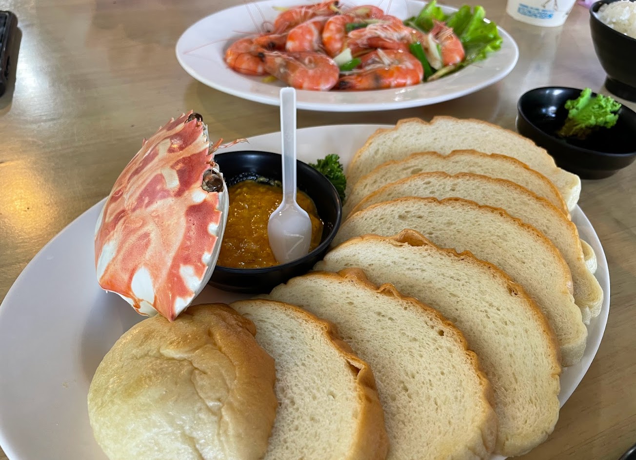 水煮蝦,蝦肉彈牙。咖哩螃蟹醬配麵包孩子很愛。可以二訪的餐廳。推推