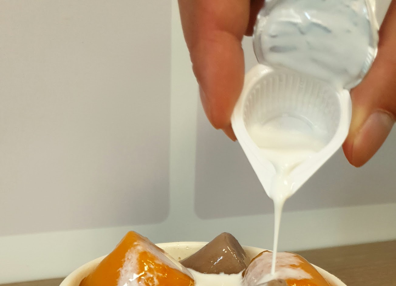 芋圓仙草奶凍,居然只有芋圓和仙草凍,再給你一小盒奶精,一點湯汁和冰塊都沒有,而且店員臉有夠臭