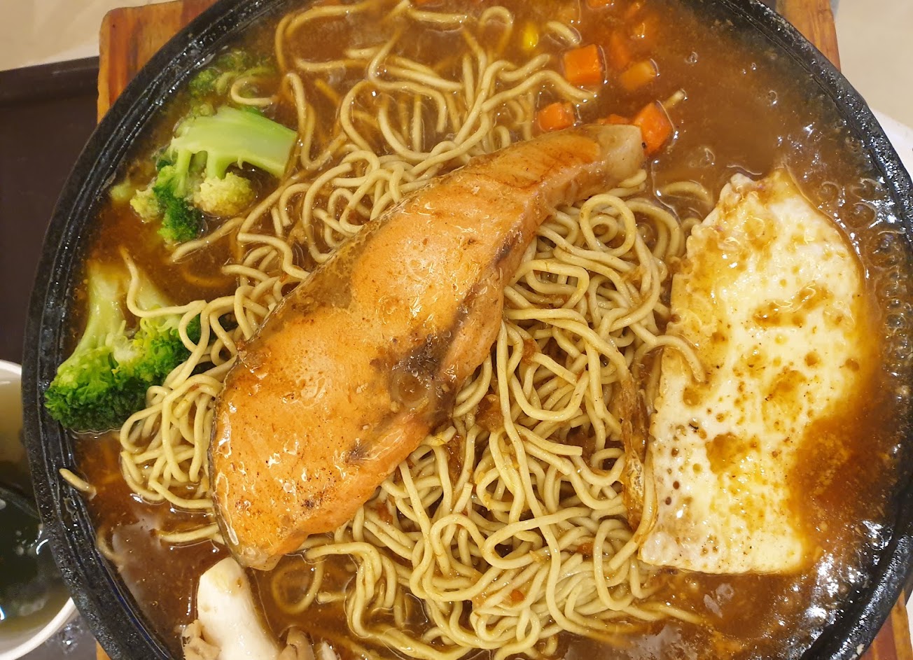 花雕雞飯的雞肉是預先炸好的,消費者點餐才過香料配菜拌炒加熱,所以有點外熱內溫,而且雞肉有點炸的過老,可惜了採用腿肉部位,至於飯跟配菜的部分都偏涼,但整體口味還算ok。朋友則是點了鮭魚鐵板麵,份量十足,看朋友吃個精光,應該不會難吃? 以美食街的餐點來說,可以過關 …
