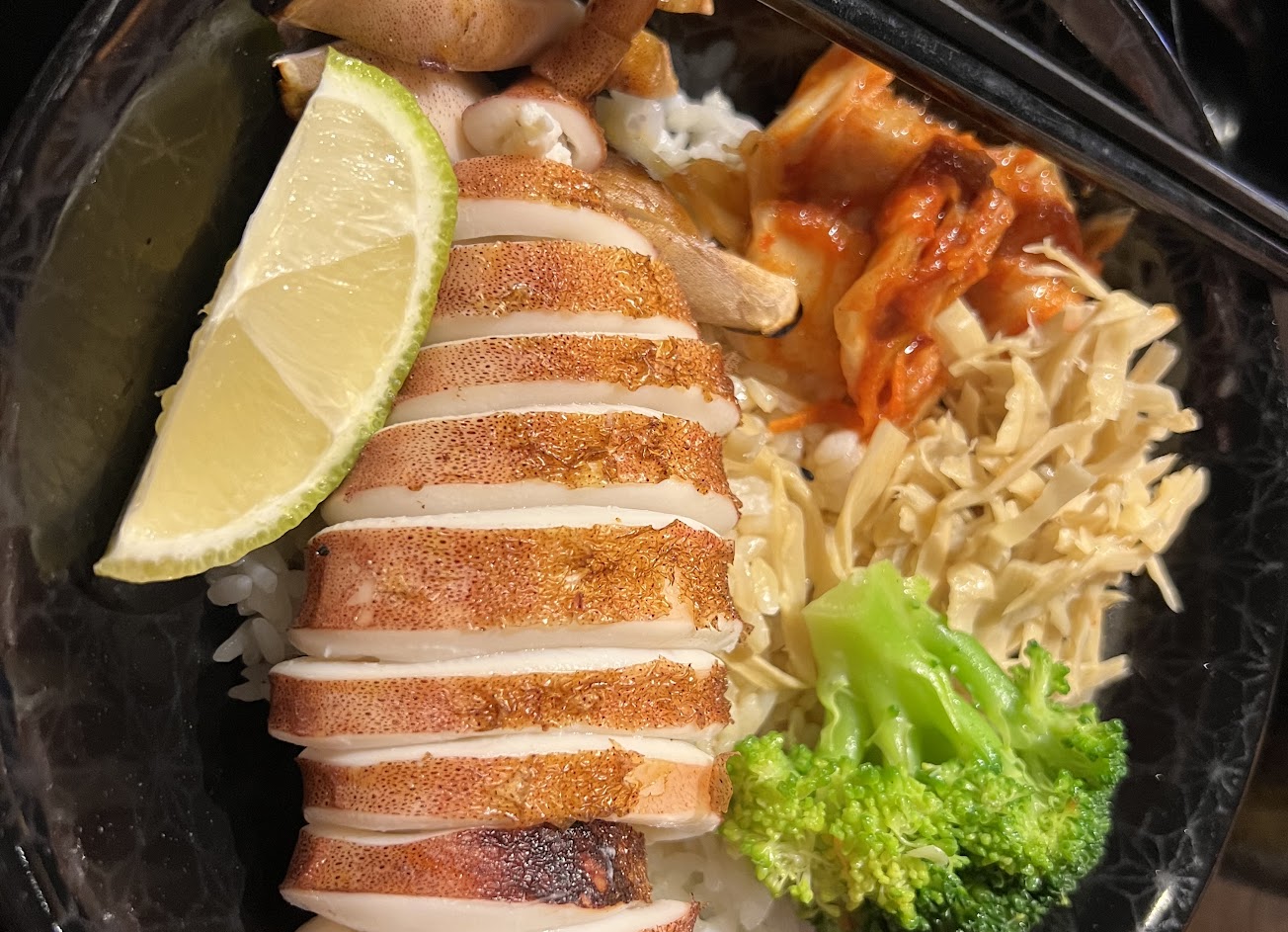 這篇評論不是為了推薦贈送的飲料,而是貨真價實的CP值,今天的透抽飯,透抽烤的剛剛好外皮還有些脆度,內層肉質仍保持鮮甜,一點都不柴,搭配薑汁醬油,真的優秀。副餐的生魚片也是新鮮與鮮甜。