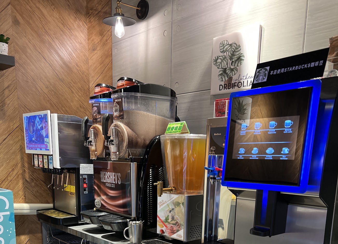 可樂雪碧是罐裝的,還有氣泡水、綠茶、Hershey’s的巧克力冰沙、星巴克咖啡豆!