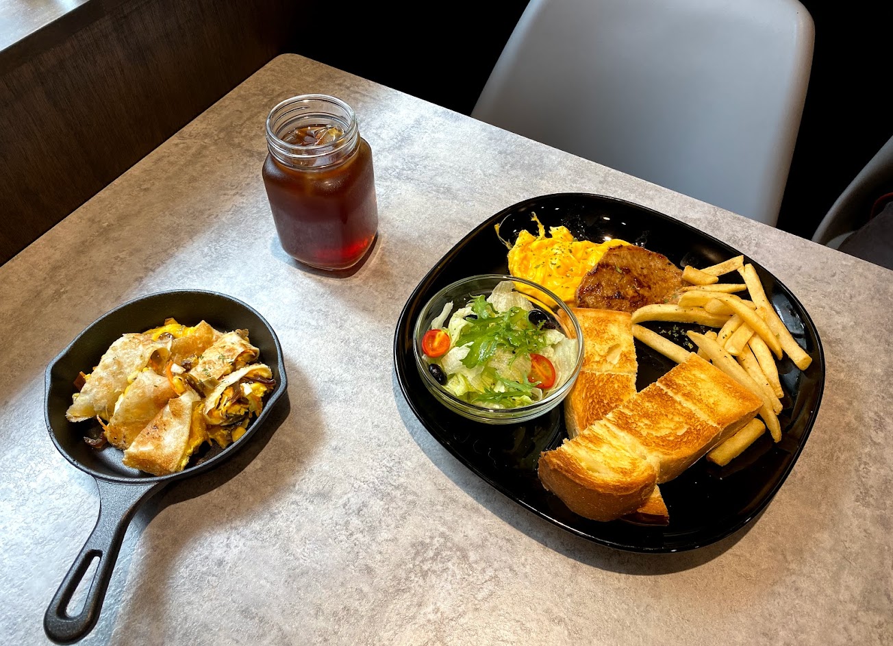 防疫期間有與其他人隔開座位位置跟用餐環境還算舒服,櫻花蝦蛋餅算重口味的,餐點上桌時海鮮味非常的濃,當天吃的餅皮偏軟不是脆的那種,套餐的厚吐司QQ的口感蠻好吃的,旁邊的配餐沙拉醬料不好吃,他們家的薯條是細的,還有一坨炒蛋味道還算不錯,當天紅茶偏澀,沒有到很好喝,當天還有買紅豆銅鑼燒外帶,銅鑼燒皮是稍為QQ的那種適合當點心,胃口小的吃完會稍有飽足感!