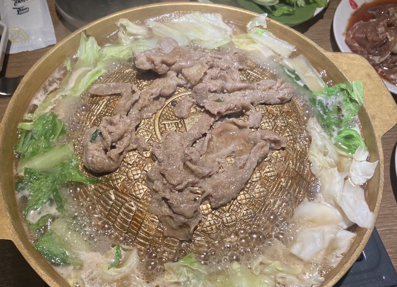 烤肉銅盤很酷,中間烤肉旁邊煮菜,中間烤肉的汁流到四周可以為蔬菜增添風味。