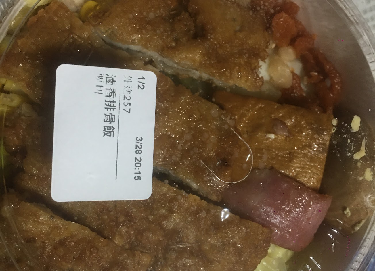 魯排骨是炸過再沾魯汁滿小塊,整個配菜鹹死了,真的太鹹了,很鹹的打結海帶,三角油豆腐,飯還有醬油,血壓都高起來了