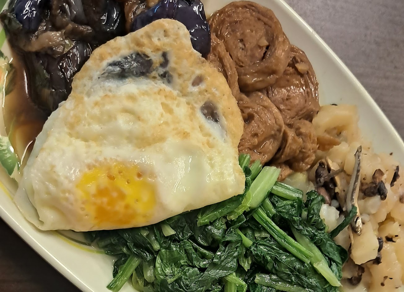 控肉鹹蛋蒸蛋茄子筍子肉鬆高麗菜兩碗