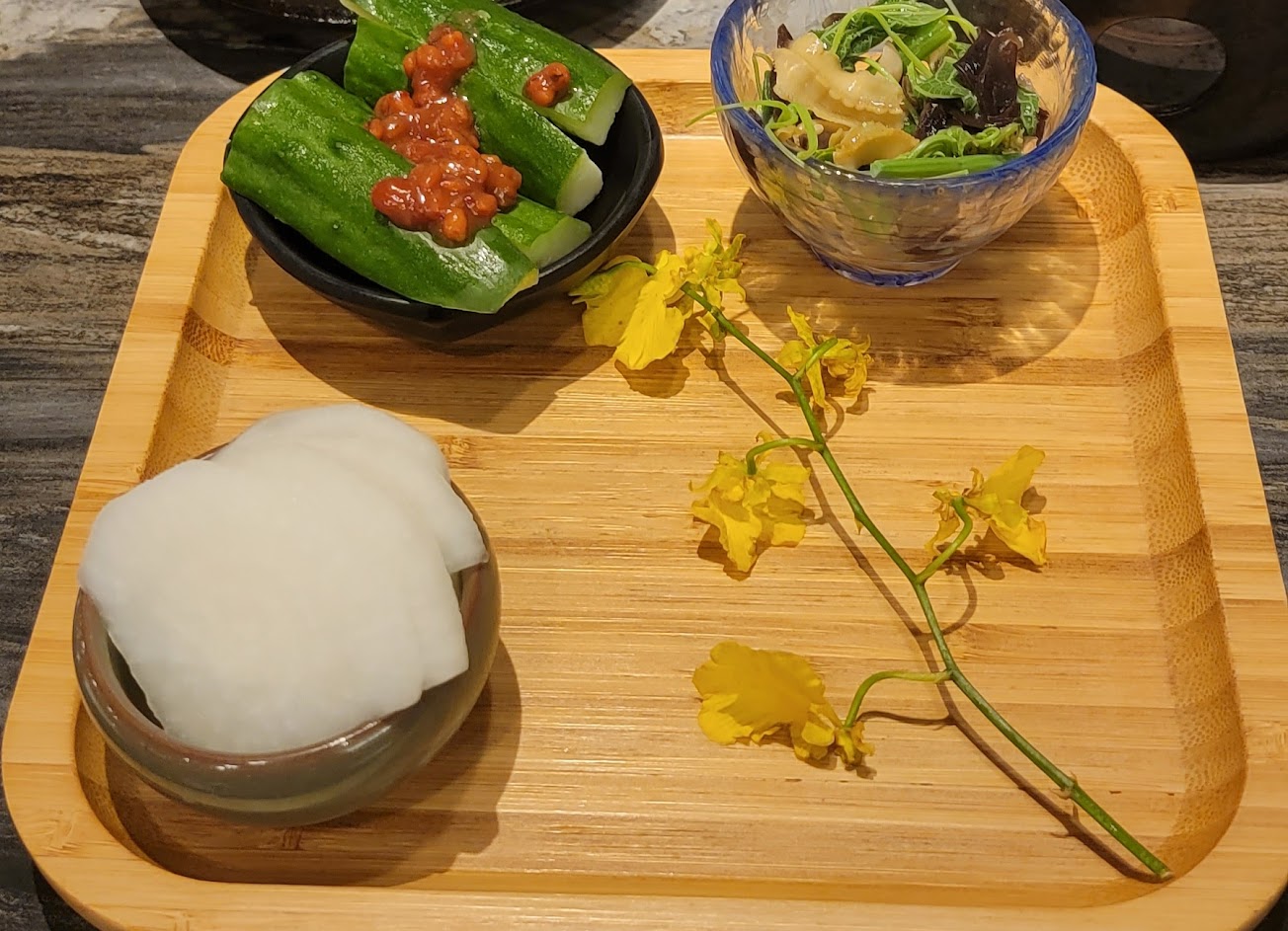 首先,我得說這餐點對於相應價格,是合理的,但在用餐感受上,卻是極糟的,第一餐桌極小,如果要似懷石料理的感覺呈現餐點,那很好,可儼然餐桌根本容不下位置,當兩人份和牛以及加點的肉片上桌,基本都占滿整個餐桌,醬碟也只放得下一碟,只能很克難的烤肉和沾取醬料。