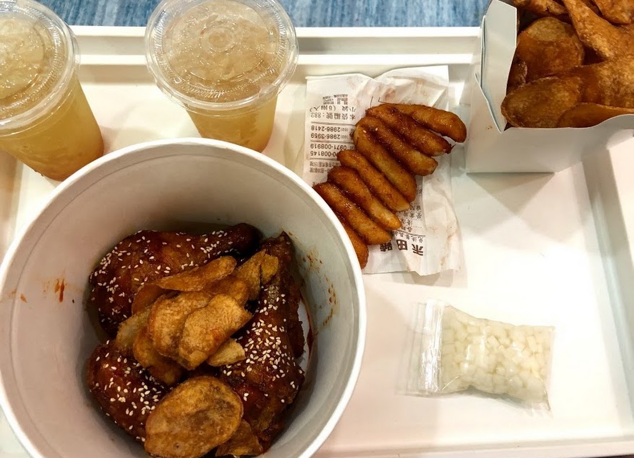 餐點:大份甜洋釀炸雞、薯片、蜂蜜柚子茶2杯、加點炸年糕