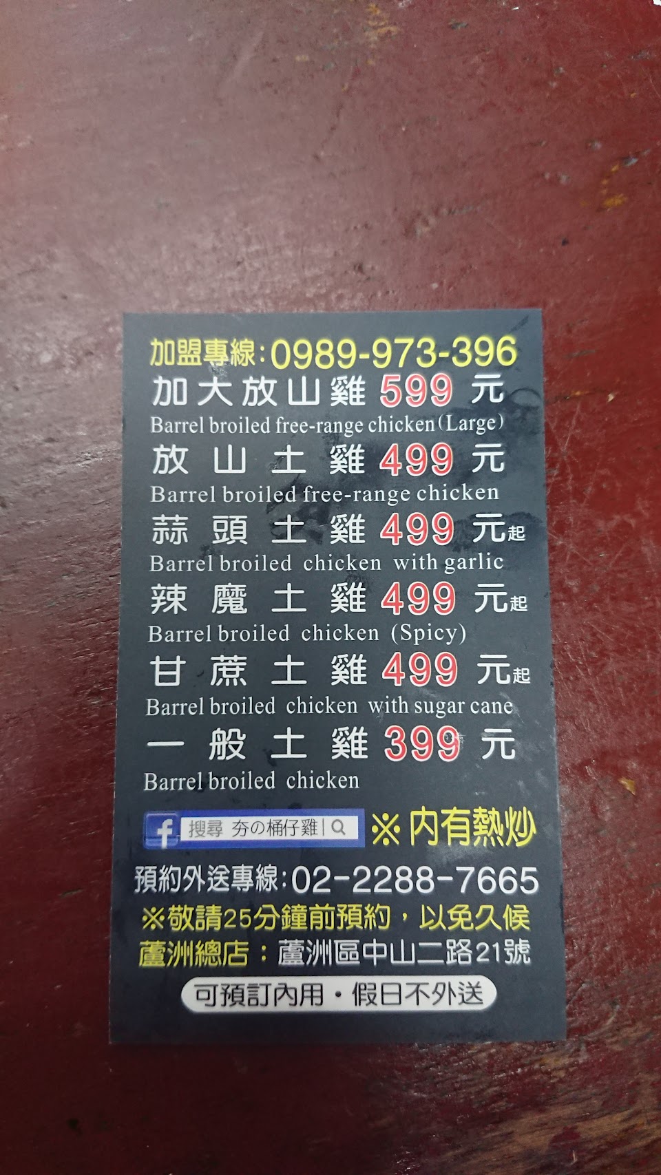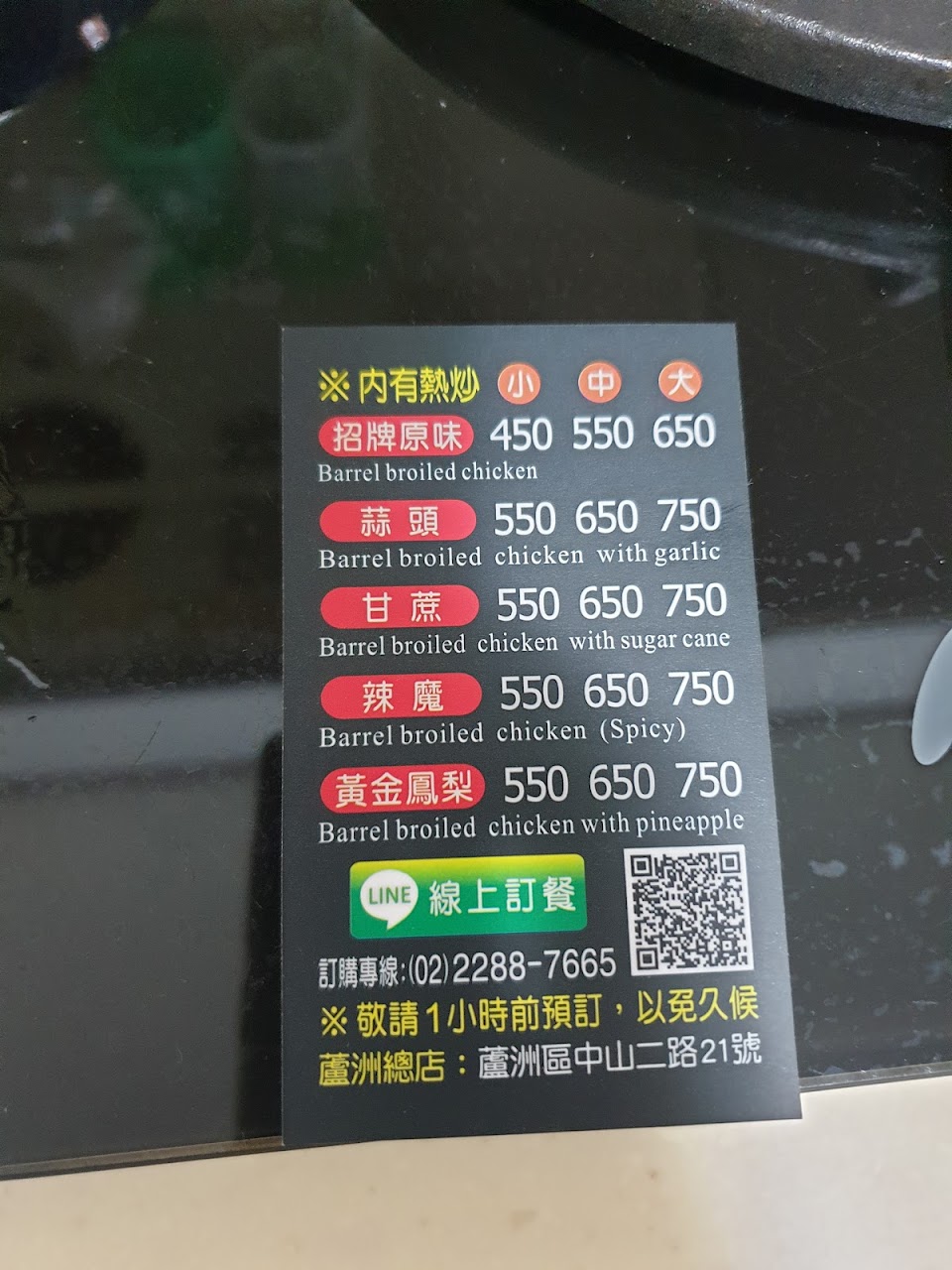 電話預訂,車停店門口,付錢,拿雞,趕快開走,因為我是5:30取餐,那里車子超多。