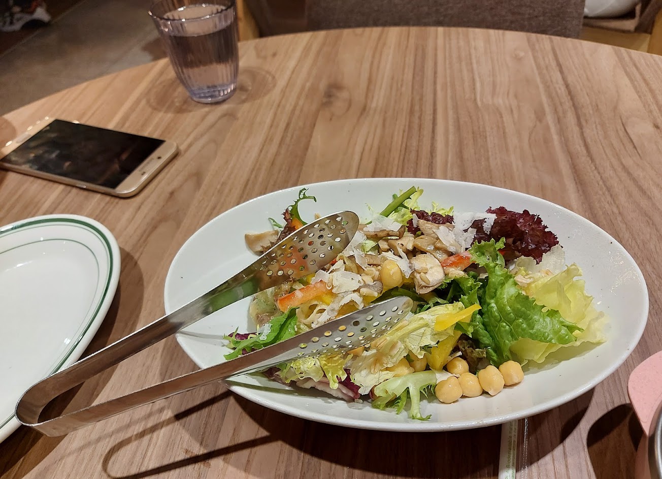 沙拉方面凱薩醬清爽呈現,不過有點酸而且酸過頭,建議可以酸可以少放個一半以上,多加點鮮味(類似鯷魚之類)來呈現會更好吃!