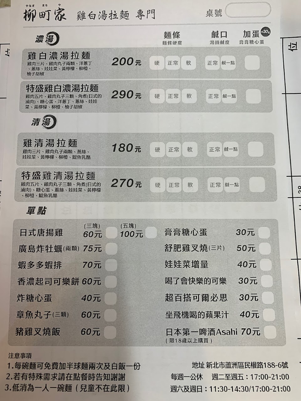 光是上面麵吃完都還無法配上拉麵上的雞肉、角煮、溏心蛋,店家有免費加麵,舉手告知小姊姊要加麵,雞肉嫩、角煮入味、溏心蛋完美!! 加完麵再加飯、恨不得把碗整個吃下肚,完食,不留一點食物與湯是我對「柳町家拉麵」的尊重與喜愛!! 服務 內用 餐點類型 晚餐 平均每人消費金額 $200-400