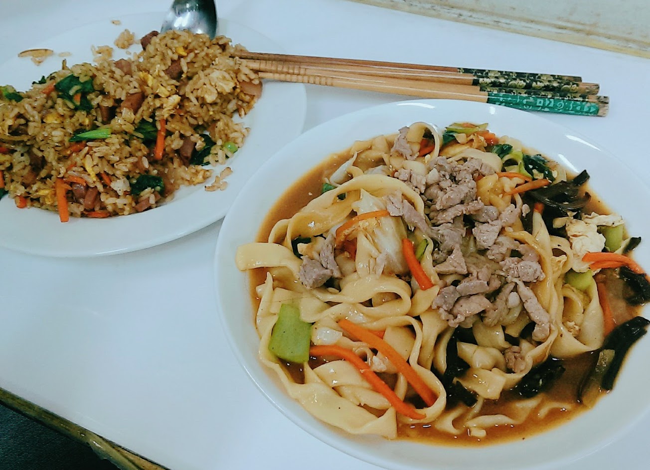 份量充足而且味道也不錯。環境還滿好的。提供筷子的機器很酷。 大份的炒飯兩個人可以吃得很飽,炒麵/湯麵則剛好。麵條有點像刀削麵。 餐點好像可以要去做成辣的,但是我們沒點過。 便當也很好吃,我比較喜歡雞腿便當。