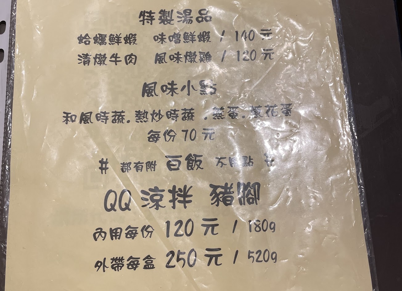涼拌龍鬚菜很嫩,冰冰涼涼又帶點酸非常開胃;豬腳很Q,有點骨頭要花掉耐心啃食;蒸蛋嫩的恰到好處,裡面也有料(但我忘了是什麼);主角是老闆每天進貨的新鮮魚貨啦~~~~(結果我們忘了拍照)新鮮的魚經過老闆巧手,外皮煎的酥酥恰恰,裡面還保留魚本身的鮮甜,不用過多調味,一點點鹽就能帶出他的美味! 鮮蝦蛤蜊湯也很鮮甜,是一家吃了會讓人還想再來的店:)