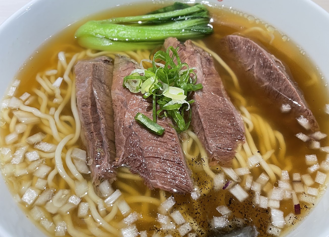 湯頭:清澈順口,但較中規中矩,湯裡除蔥花外,有大量切成細丁的洋蔥,入口時會有不同的口感跟口味變化,喜好度因人而異,個人覺得是滿有趣的; 麵條:細麵量不算多,無特別感受; 肉:牛肉、牛筋、牛尾各兩片,牛舌一片。牛肉切成細長條狀,有厚度,但口感偏硬;牛筋並未滷得軟爛,保有微微硬度,仍帶一些牛臊味;此前沒在牛肉麵裡吃過牛舌和牛尾,牛舌雖然烤薄片好吃,富嚼勁。但這次在牛肉麵裡我覺得並不適合,處理得偏厚,咬久了卻有種噁心感跟肉腥味。牛尾則出乎意料地好吃,有種在吃厚切豬五花或帶皮羊肉的感覺,能同時吃到肥肉跟瘦肉的口感跟滋味,滷的味道也好。