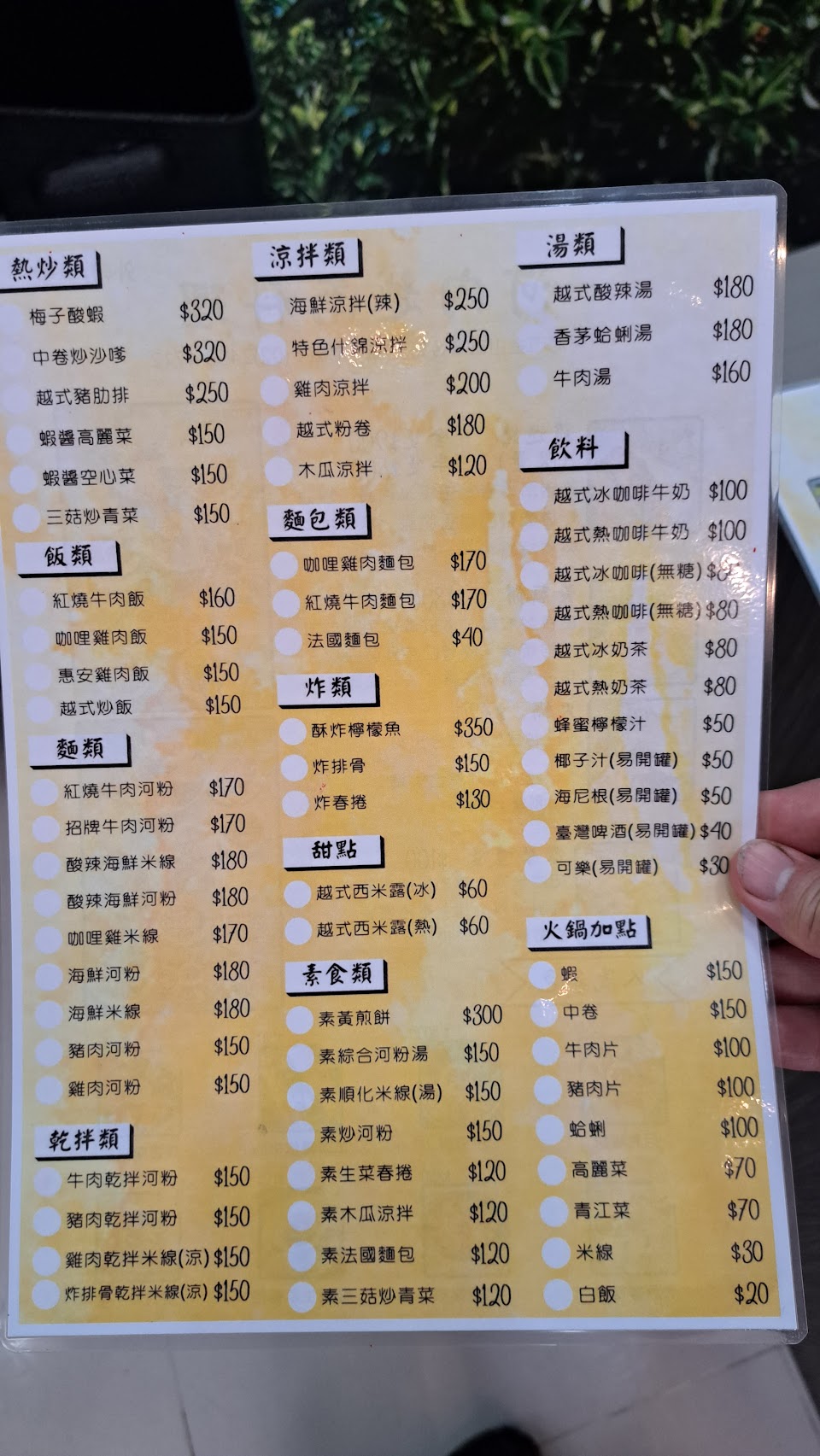 停車方便,點的菜中越南麵包和月亮蝦餅挺好吃的,其他菜覺得一般。
