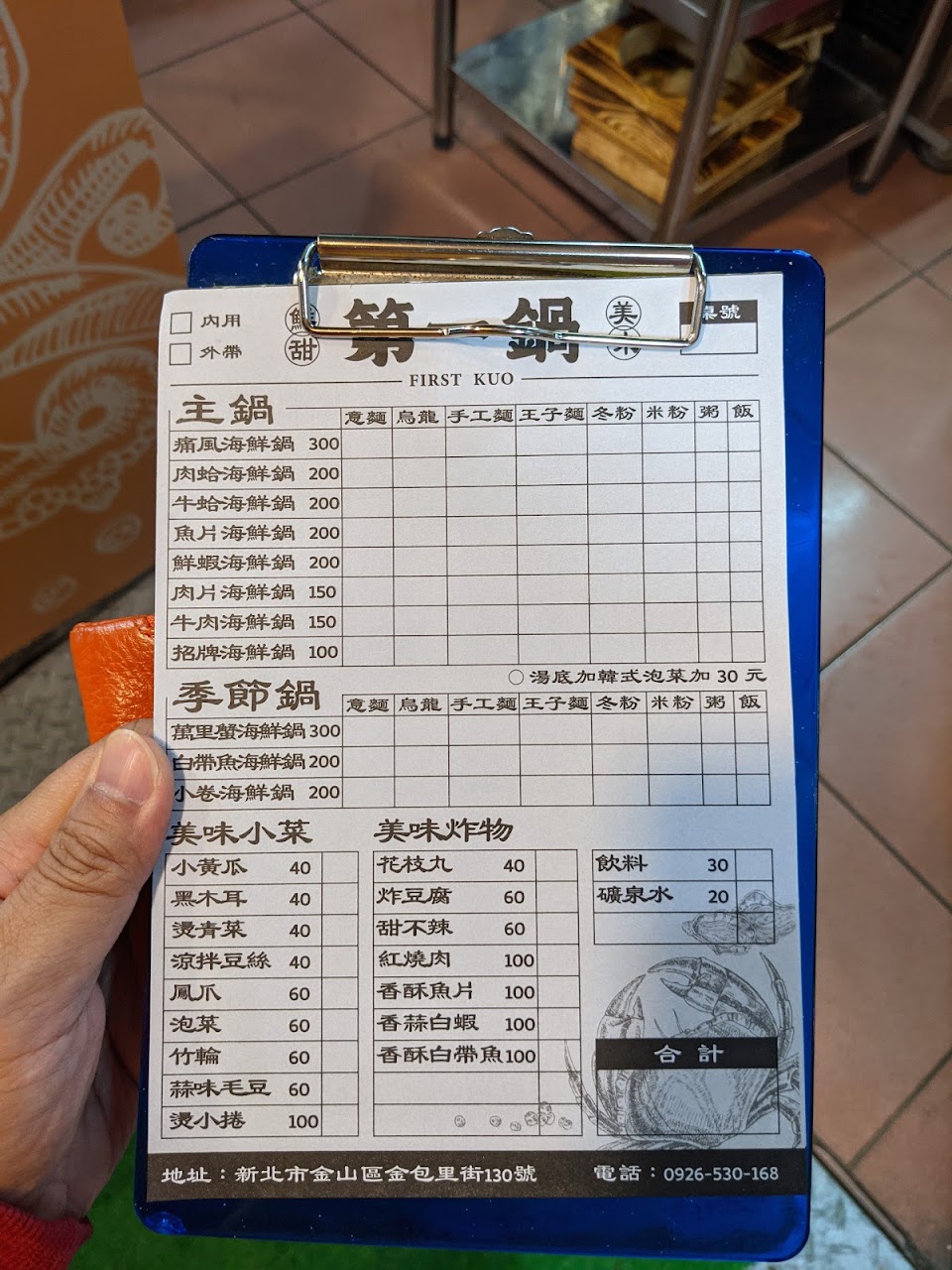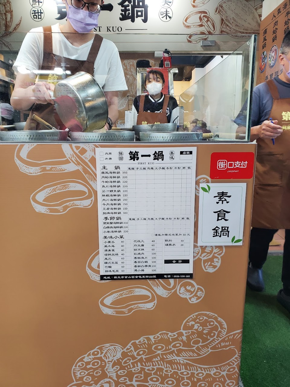 第一鍋位於金山老街算是比較後面的店,用料很新鮮,服務也很好!只是有點小可惜的是不知道是不是我去的時間客人略多,所以我的海鮮鍋感覺上煮得有點久,所以螃蟹有點比較老了,但整體來說還是好吃的!