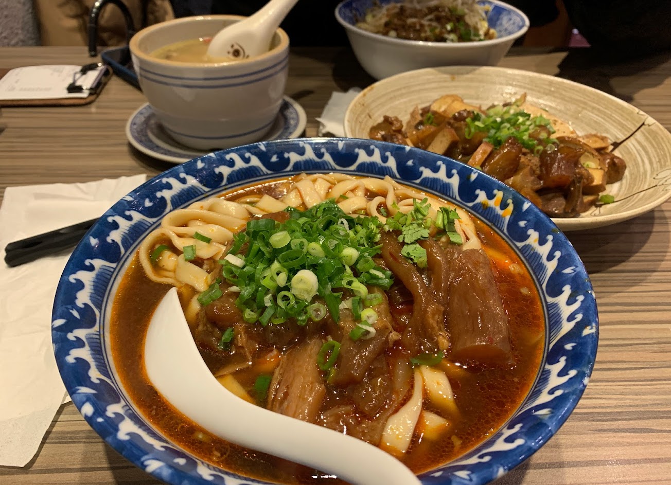 湯頭一開始浮辣油會辣,攪一攪就是正常紅燒湯小辣,麵雖然是刀削但覺得滿工整(?的,很厚又不會有麵粉感,可以有88分。