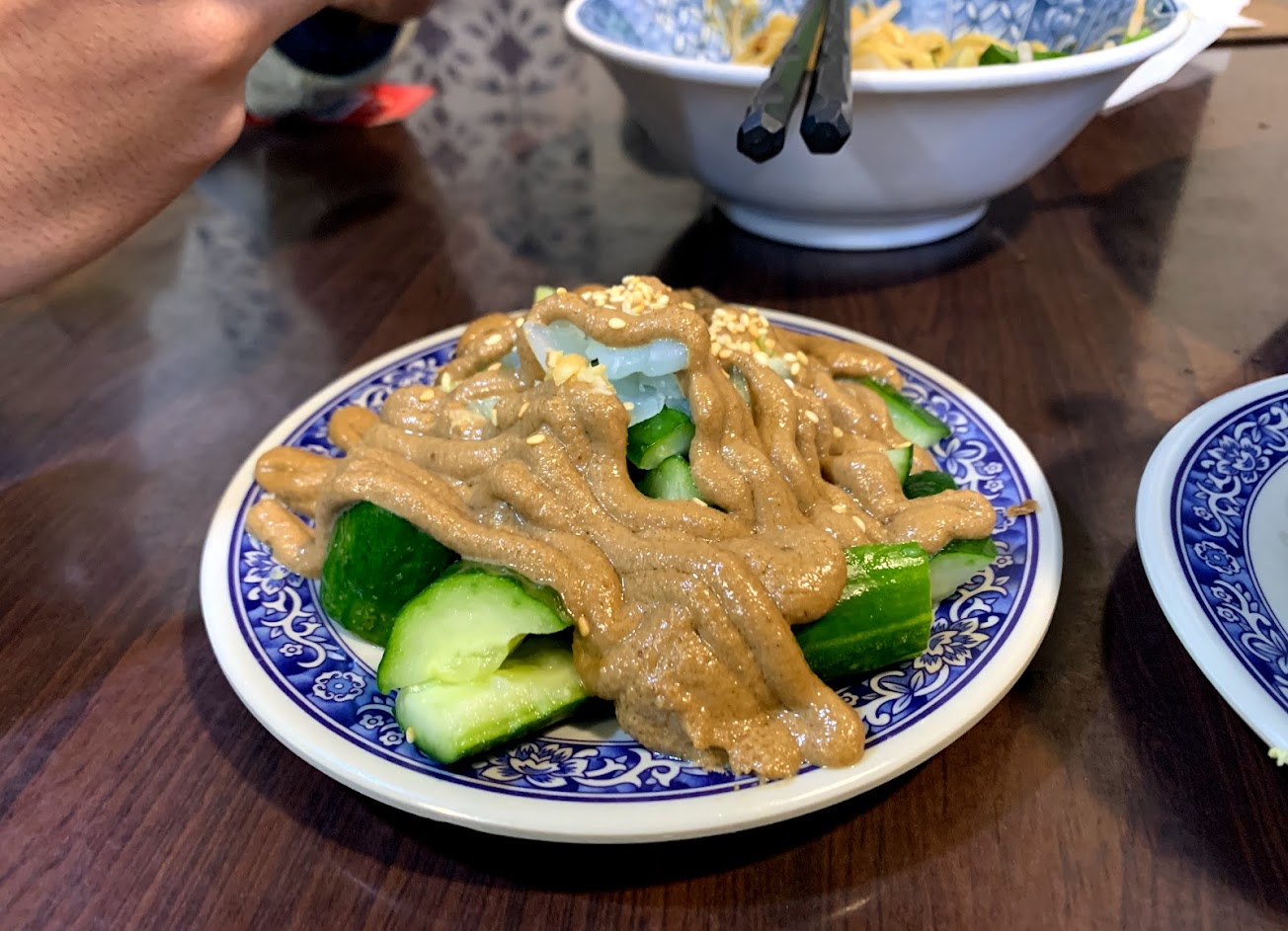 很認真享受最完美搭配的麻醬小黃瓜,他家的麻醬真的真的太好吃了,花生味濃郁,也夠濃稠,盤子差點拿起來舔!真的無敵喜歡? 極力推薦大家~