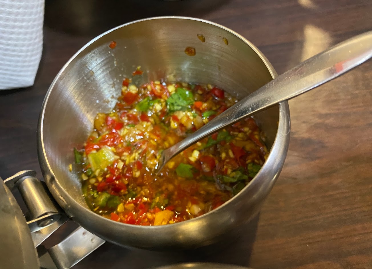 不吃牛的我點了乾麵吃,細麵麵條的表現比刀切麵好些,可惜整體辣度跟香氣不是太明顯,若加入一旁的辣牛油跟辣椒醬來提味會更好。