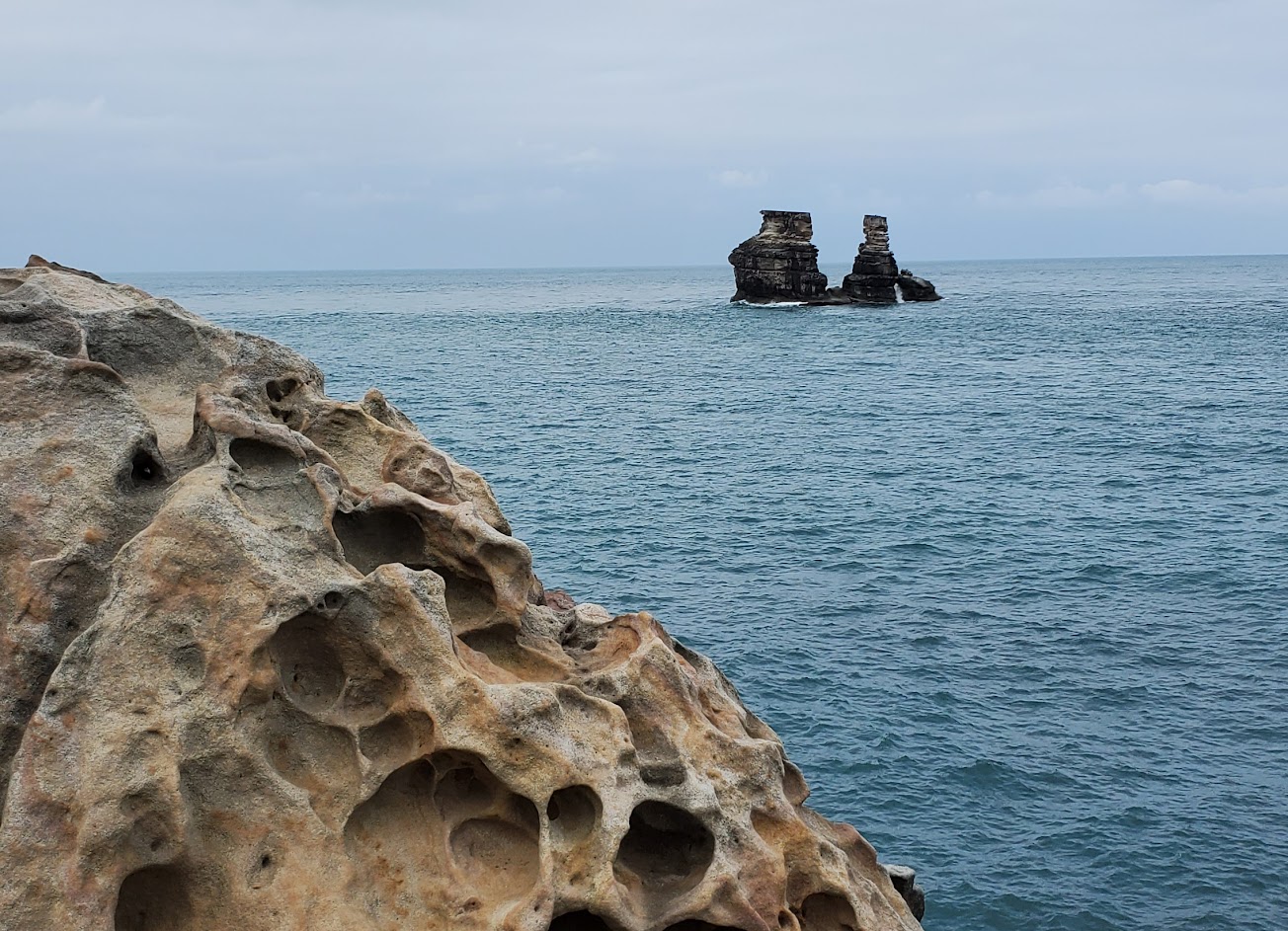 從早期的軍事海防管制區轉型為觀光勝地,仍留有舊營房、碉堡、砲台及原始自然生態,是一條三面臨海且視野極佳的森林步道。獅頭山的環狀步道兩旁樹木成蔭,走來涼爽且路面平緩,適合全家一起出遊,位於入口處的『彌勒佛-阿福』,笑瞇瞇的超可愛,別忘了來跟祂合影留念,往裡走還可以欣賞有淒美「夫妻石」傳說故事,貌似兩座燭臺的「燭台雙嶼」,拍攝最好的角度就在這個觀景平台,從鋼製圓形框景往外拍,燭台雙嶼這一對海蝕石柱宛如一對攜手對望的夫妻,也很適合情侶一起來留念。以及進入北海岸的神秘海岸,在海蝕平台區欣賞豆腐岩、看砂岩遺跡。