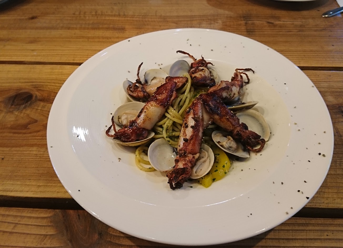我們四人點了一個披薩一個義大利麵一個燉飯,一個起士薯條、加上兩個甜點(提拉米蘇、焦糖起士蛋糕)沒有一道是不好吃的,因為是漁港附近吧!海鮮類的都非常新鮮,如果在附近很推薦來這一家!他們還有一隻非常可愛的店狗,很親人很撒嬌,隨意拍照摸他都可以但不要餵他吃餐廳的東西唷!因為狗狗不能吃太鹹的食物