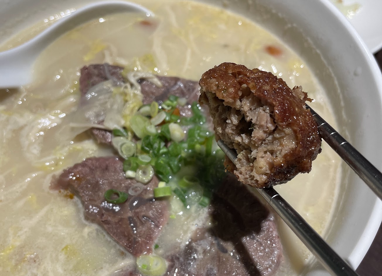 「紅燒半筋半肉牛肉麵(小碗)($178)(加牛肉丸+$28)」份量部分我覺得小碗吃完剛剛好,不會到空虛或太撐。湯底我算濃郁,但對我來說有點鹹,好吃但沒什麼特殊的記憶點。不過朋友倒是挺驚豔的XD 肉跟筋的處理當然不在話下囉。另外,牛肉丸跟外面吃到貢丸那類加工食品不太一樣,咬起來沒那麼紮實Q彈,卻能吃到肉末,感覺的出是用真材實料的純牛肉做的,沒有太多添加物。