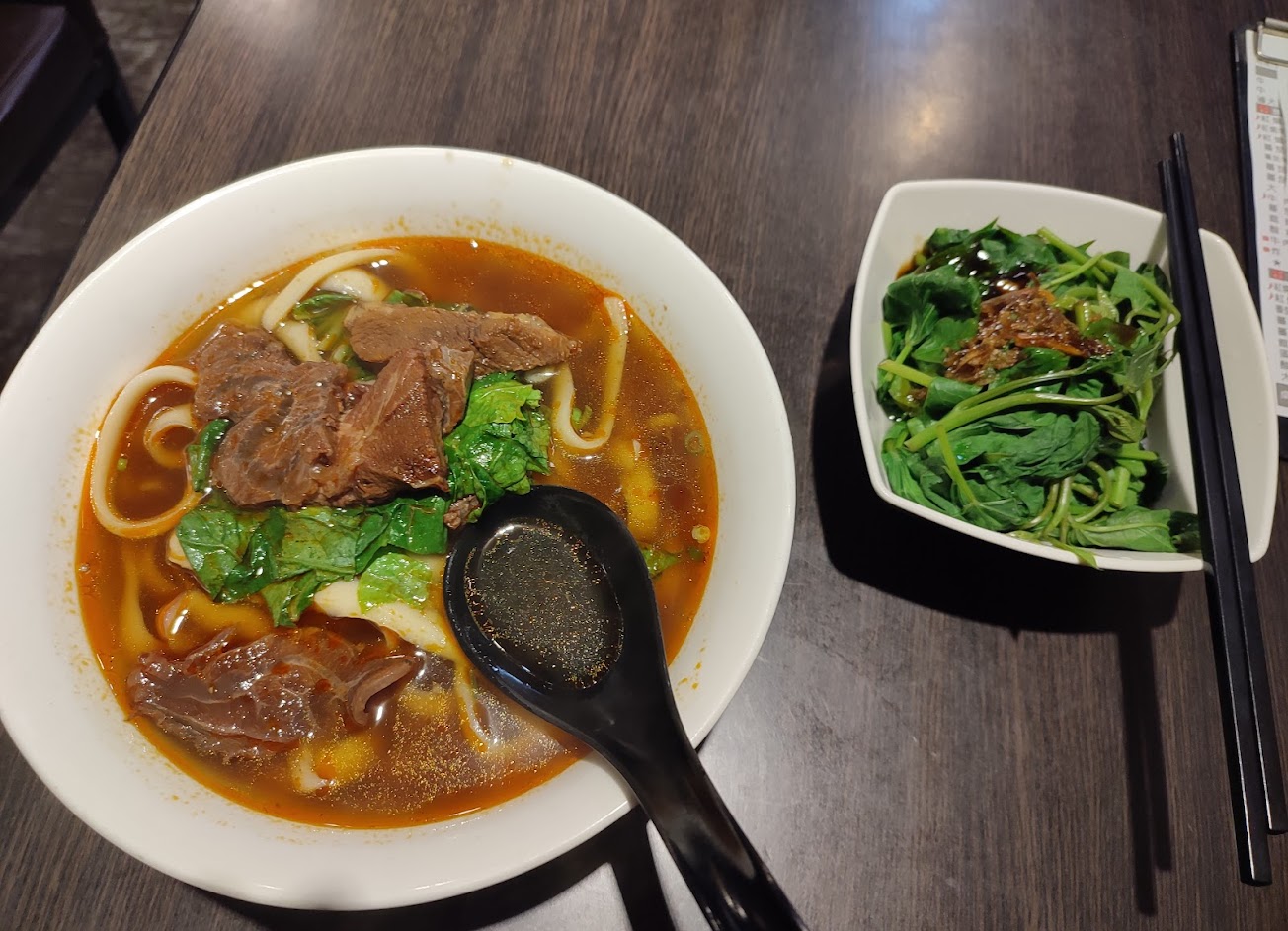牛肉炒年糕 龍鬚菜 木須肉炒麵 炸排骨 小菜 番茄牛肉麵 蕃茄牛肉麵 蔥油餅