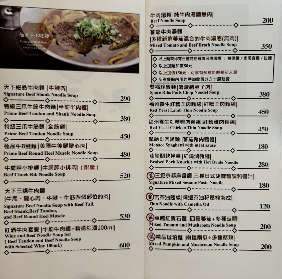 餐點精緻可口,會再介紹朋友來用餐。今天第一次來消費,點了天下絕品牛肉麵($290),服務員當下也重複了餐點名稱,結果來的是極品牛B腱($480)。由於我也不知這兩者的差別,直到用餐結束結完帳才發覺金額不對。但店家很快的為我們處理了差額的部份,從頭到尾都態度都非常親切,讓這次的消費經驗有一個圓滿的收場