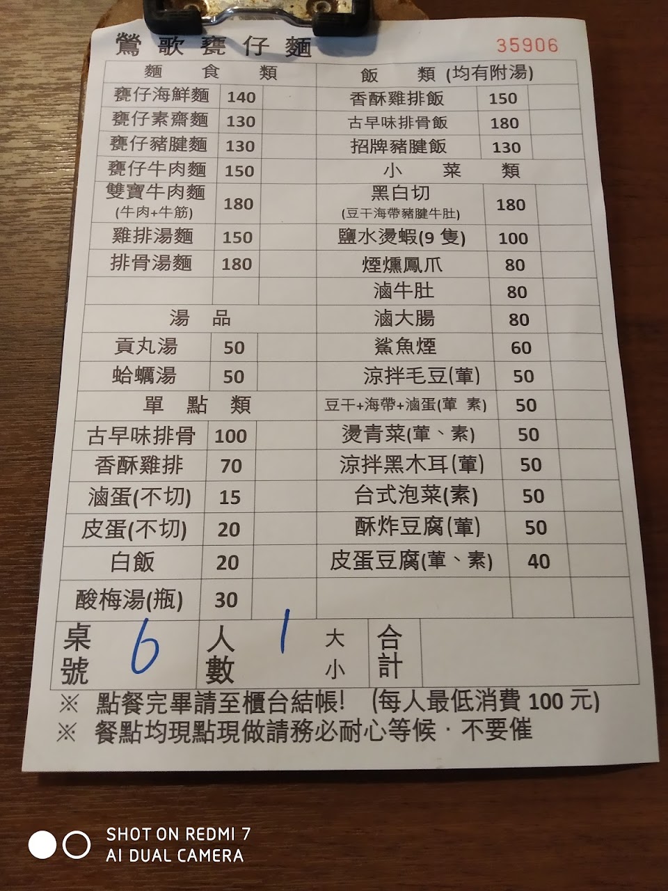 消費屬中上,有低消。本日消費月亮蝦餅、海鮮麵和牛肉麵。月亮蝦餅好吃,但份量很小。海鮮麵的麵比牛肉麵的麵好吃,湯頭都蠻好喝的。如果是鶯歌逛累了,想找個地方用餐休息,會考慮再選這裡。