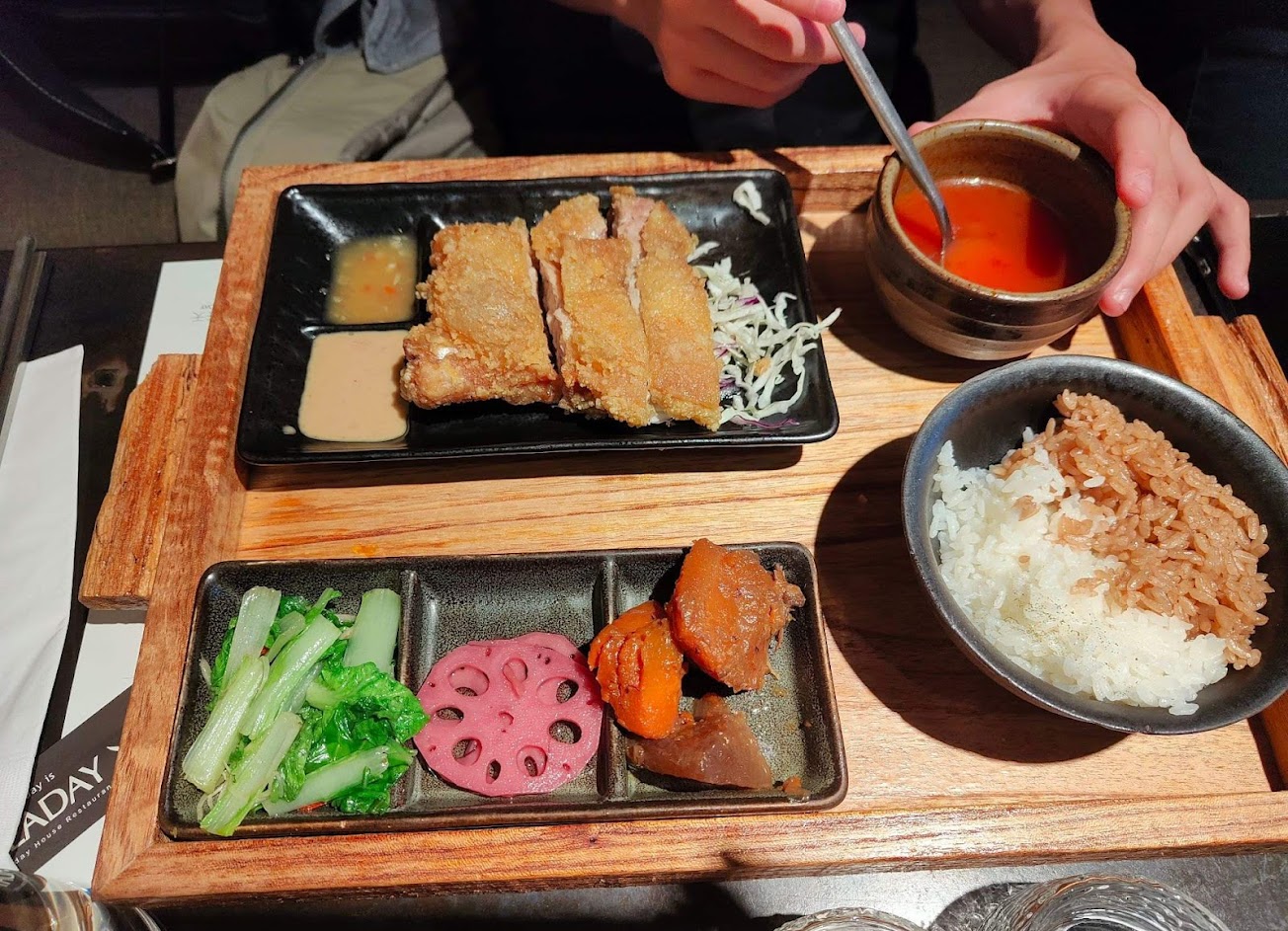 紅茶飯沒什麼茶味,請直接點白飯,檸檬雞排完全沒味道、醬料也很一般;牛頰肉綠咖喱太辣但肉蠻嫩的;雞肉燒賣還可以,干貝燒賣裡面有三色豆,炸響鈴不錯。