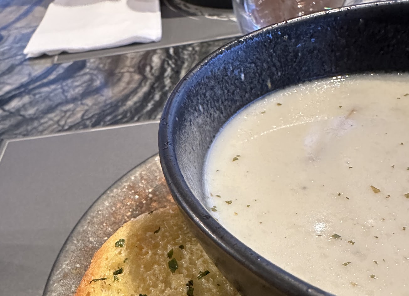 濃湯好喝?蒜頭麵包沾著吃?,沙拉是有加醋酸還不錯,有些人不吃酸會覺得很酸?麵條剛好喜歡偏硬的,海鮮新鮮??,雞肉舒肥還可以,餐廳氣氛跟音樂聽起來心情很好,最後甜點裡的珍珠比較驚艷好吃?,飲料水果茶部分好喝,不喝酸的會覺得太酸。