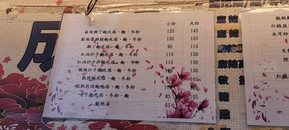 特別來看看是否可以吃的到,果真有開,因為是下午來所以本來要點麻辣雞腿麵疙瘩沒了,所以我們點了麻辣豬肉丸麵疙瘩跟麻辣雞丁麵疙瘩,老闆娘很親切動作非常的快,重點是滿滿一大碗料多實在,拿回家吃的時候,我一直撈到豬肉丸子至少有6-7顆以上,還有金針菇跟菜還有豬肉末等配料,麵疙瘩真的很有飽足感,但配上湯頭,那種辣是很夠勁但是不會辣到你會很不舒服的感覺,雖然湯汁有點鹹,但是因為配上麵疙瘩這種純麵粉的所以會剛剛好!另外看到有紅油抄手,那個抄手很大,下次一定會來試試看!還有教授麵…總之就是好吃!