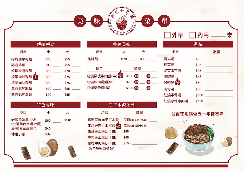 不好停車。麵條Q彈好吃,消費平價,小菜選擇不多,但是都很經典。 服務 內用 餐點類型 午餐 平均每人消費金額 $1-200 建議的餐點 老闆魯味黑白切 小 燙青菜 小菜們